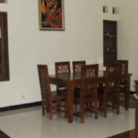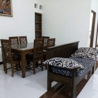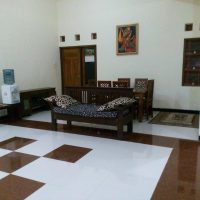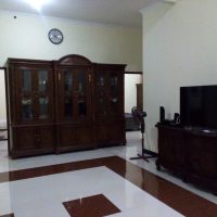 Fasilitas bersama di homestay ini sangat memanjakan, termasuk Ruang Keluarga yang sangat luas dengan sofa kulit mewah, lemari pajangan kayu jati yang artistik, dan Televisi layar datar besar lengkap dengan sound system untuk hiburan berkualitas. Terdapat pula ruang makan formal dengan meja kayu jati yang kokoh.